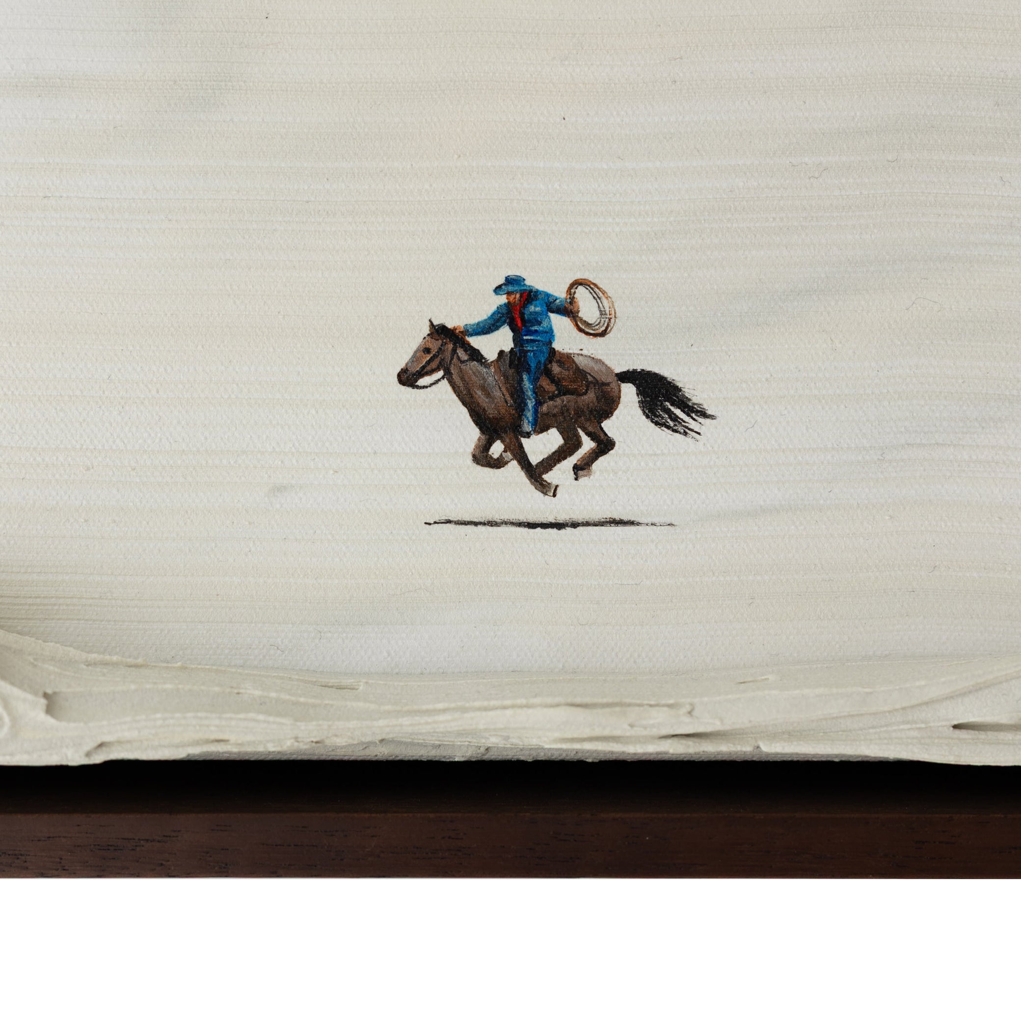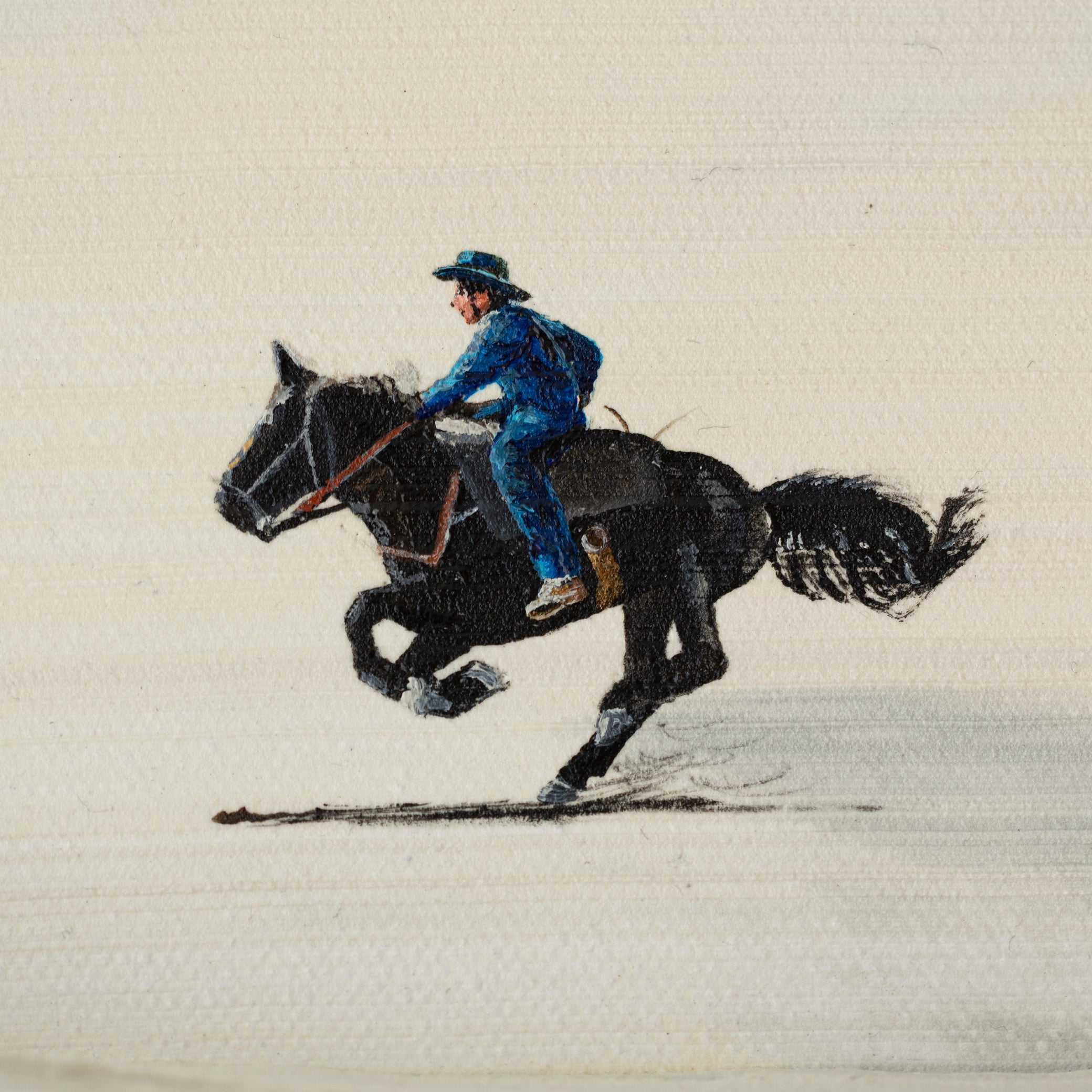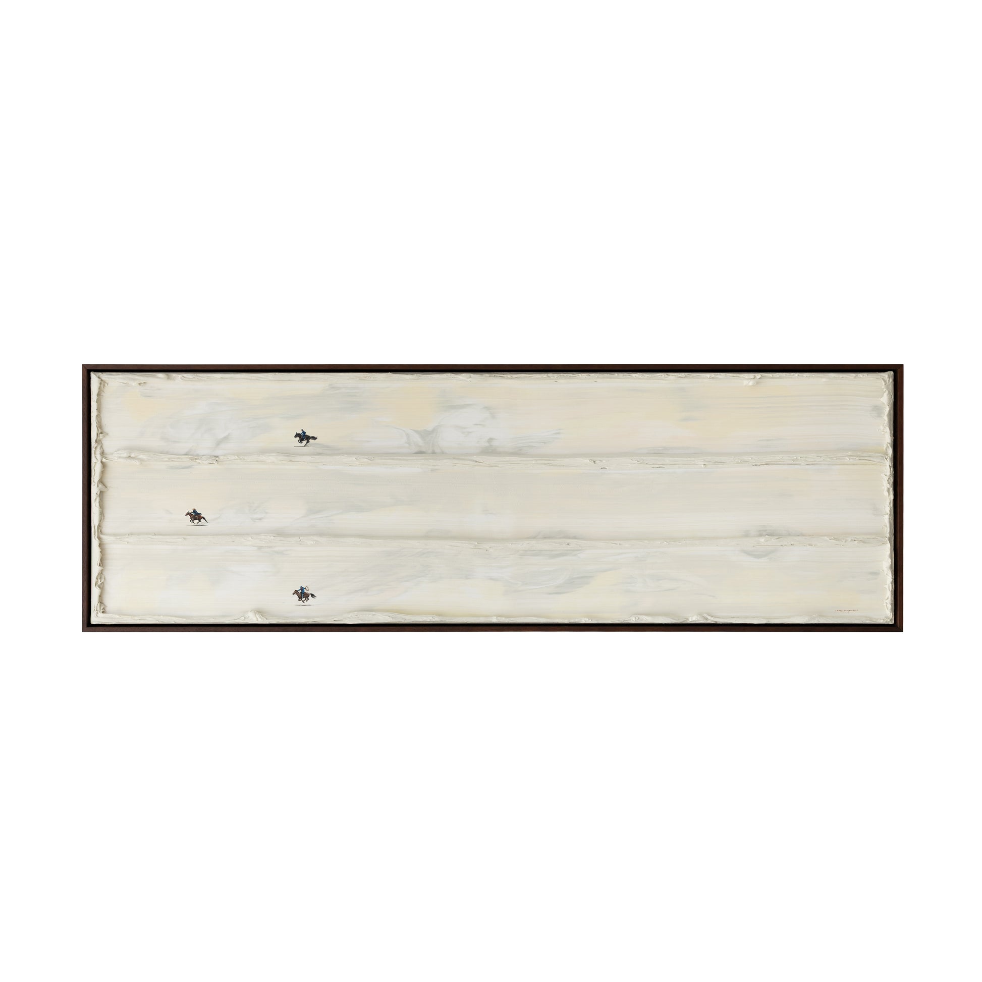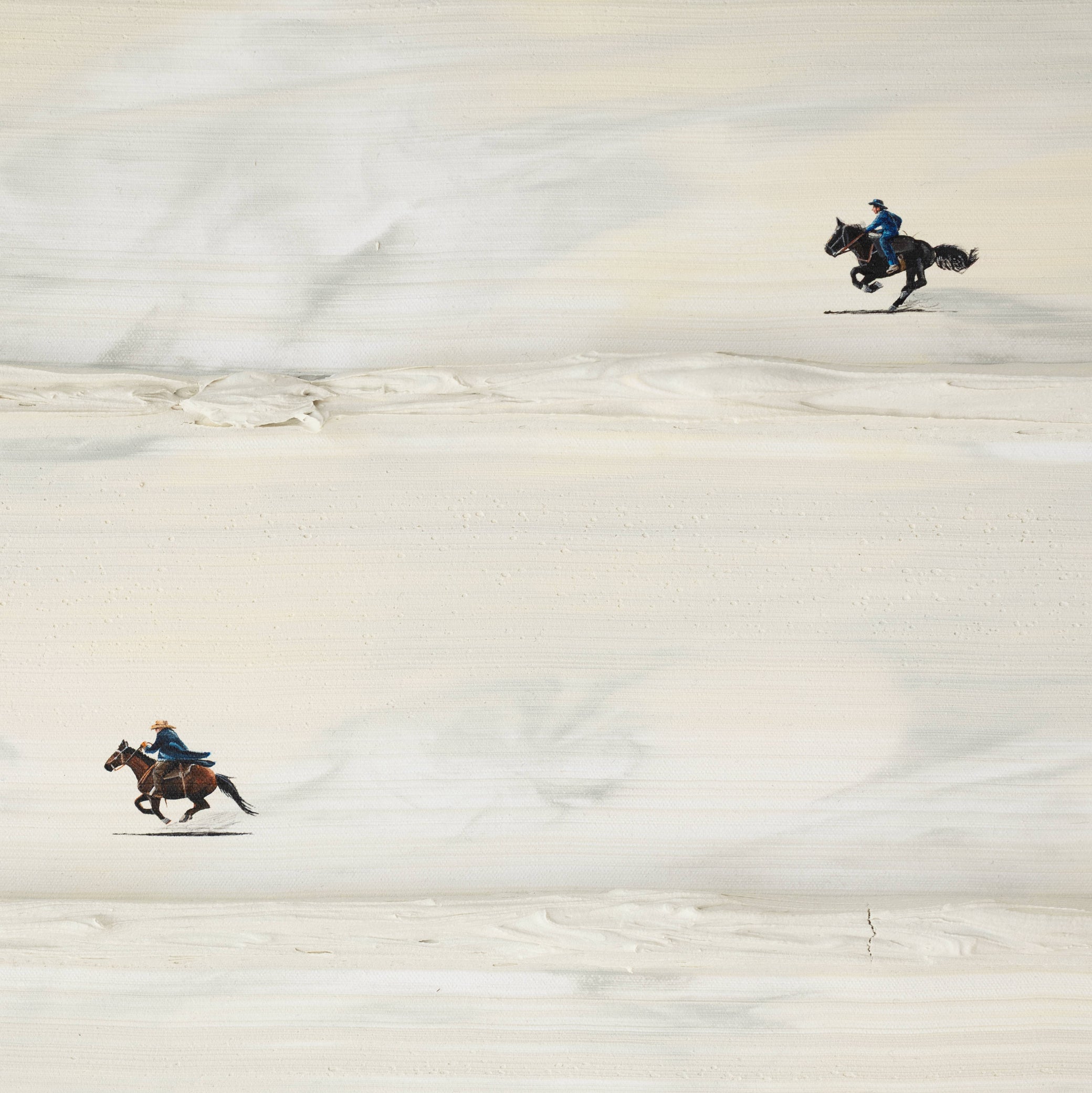Inspired by childhood games of cops and robbers, this work captures the thrill of chasing and play-acting as cowboys. Three figures on horseback traverse a dusty-hued landscape, created by horizontally blending tones of grey and butter yellow across the canvas.