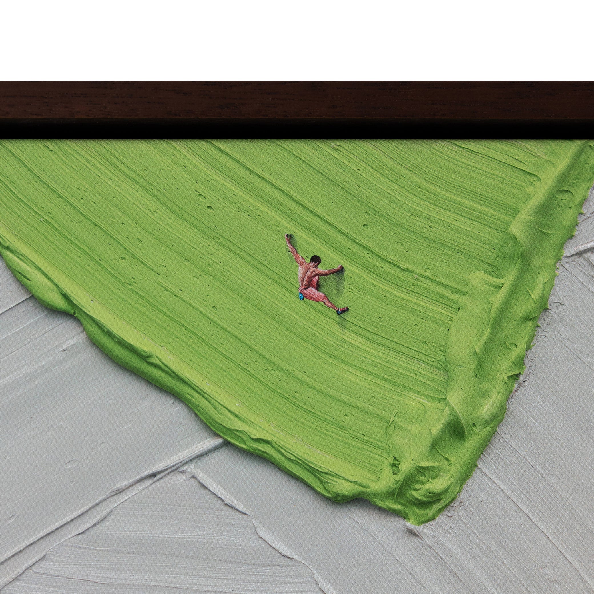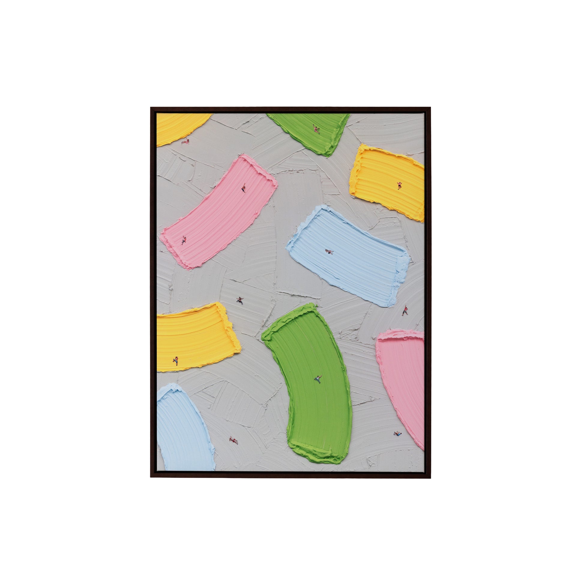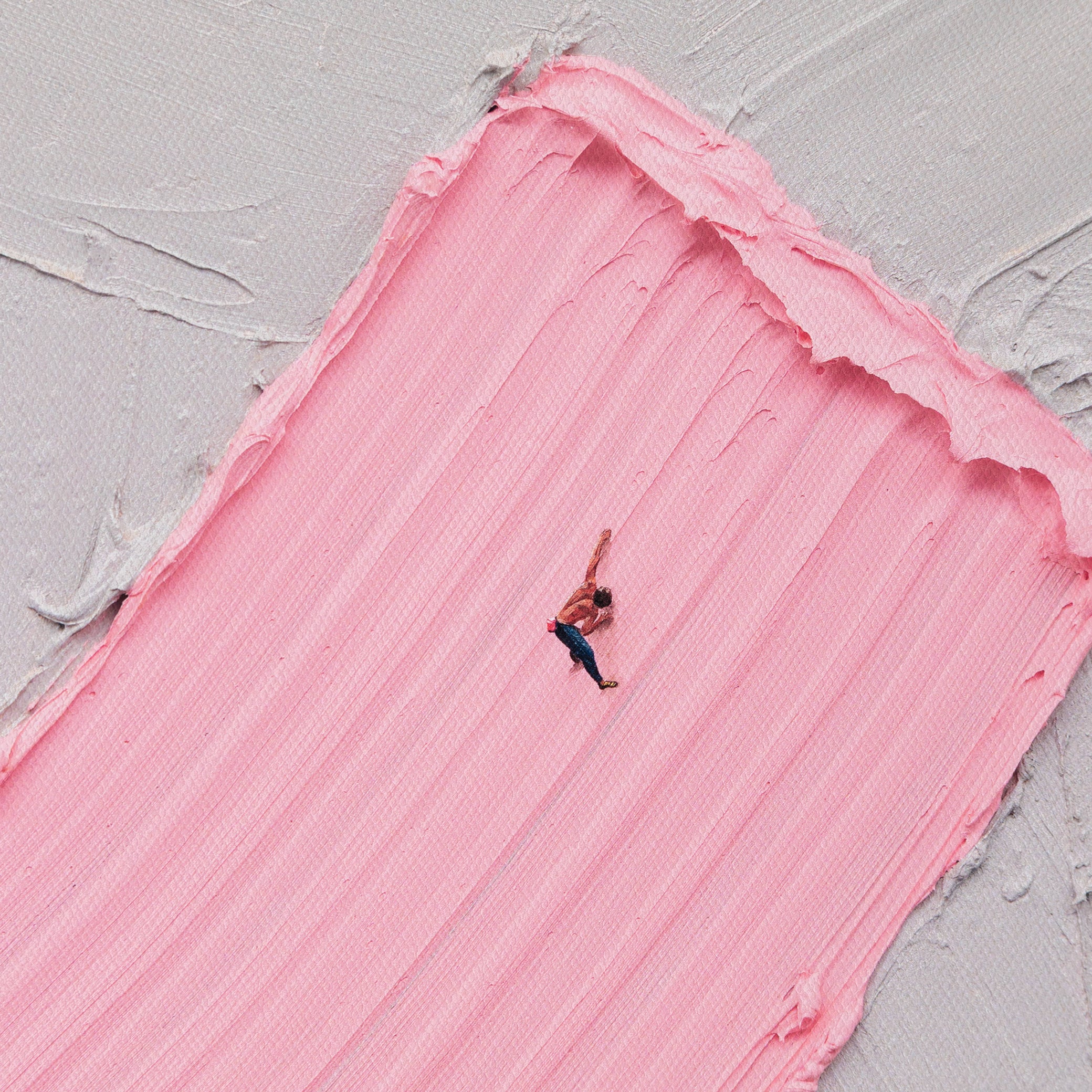 Hang In There presents a grey surface scattered with confetti-like marks, punctuated by tiny rock climbers making their way upward across the canvas.