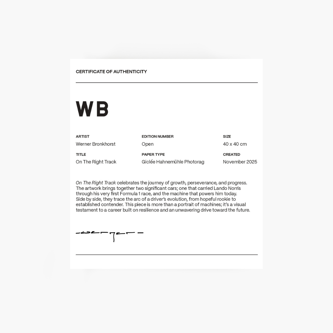 This artwork celebrates the journey of growth, perseverance, and progress. It brings together two significant cars; one that carried Lando Norris through his very first race, and the machine that powers him today. Side by side, they trace the arc of a driver’s evolution, from hopeful rookie to established contender. This piece is more than a portrait of machines; it’s a visual testament to a career built on resilience and an unwavering drive toward the future.