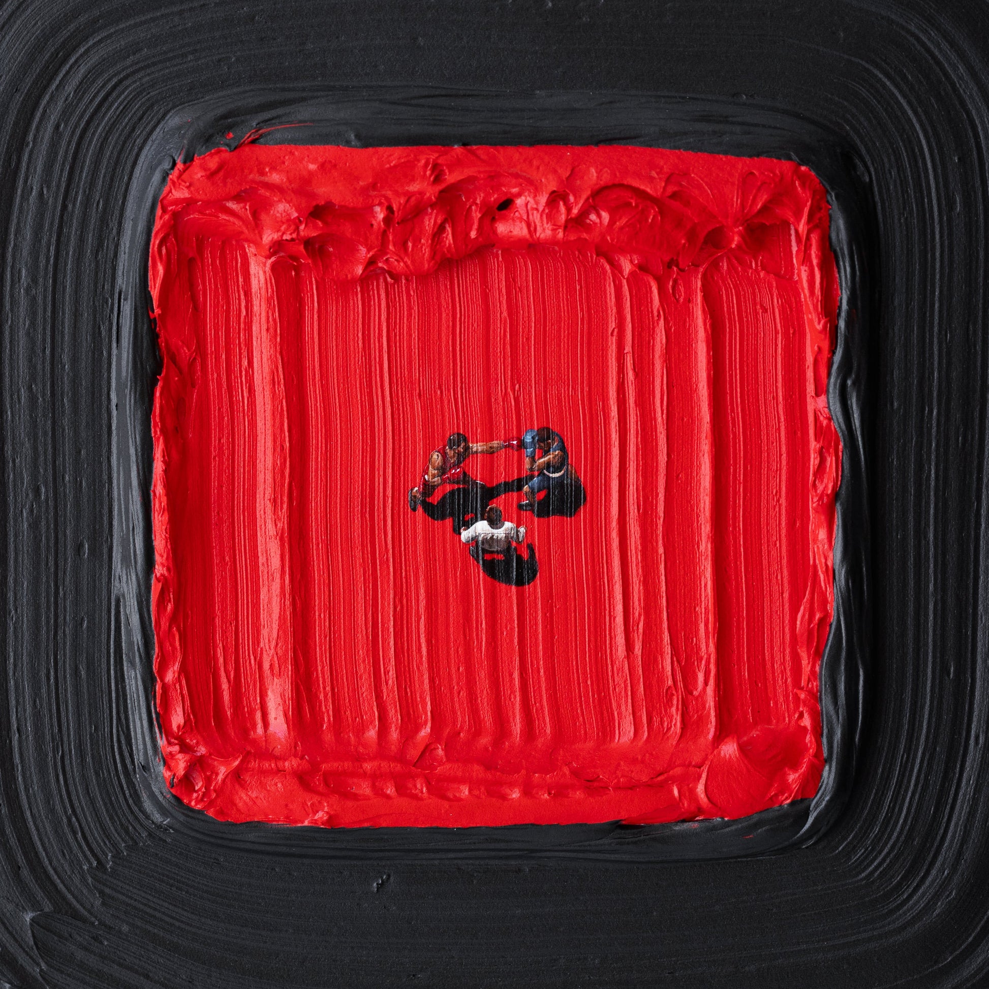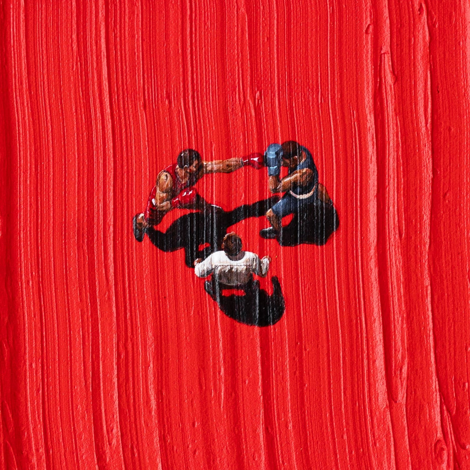 This work depicts a boxing match, where boxers move constantly, echoing the childhood game 'The Floor Is Lava', imagined as an abstract ring.